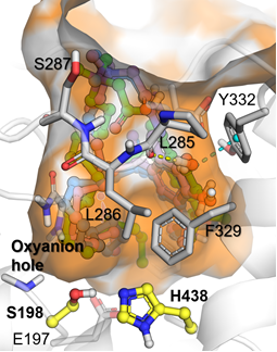 На рисунке представлена позиция связывания, полученная в результате молекулярной стыковки наиболее сильного ингибитора.