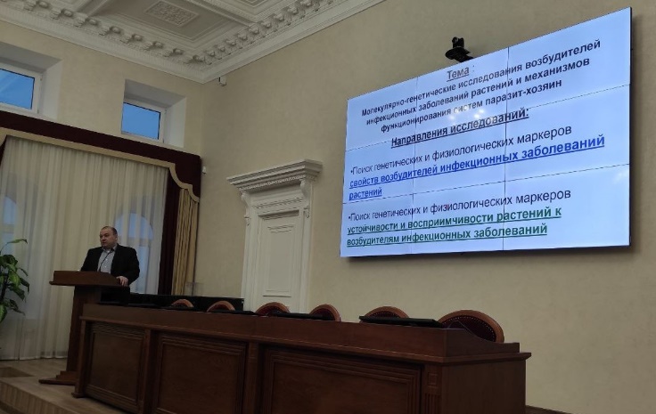 - Заведующий лабораторией Инфекционных заболеваний растений – кандидат биологических наук В.Ю. Горшков доложил о проведенных в отчетном году исследованиях по теме «Молекулярно-генетические исследования возбудителей инфекционных заболеваний растений и механизмов функционирования систем паразит-хозяин».