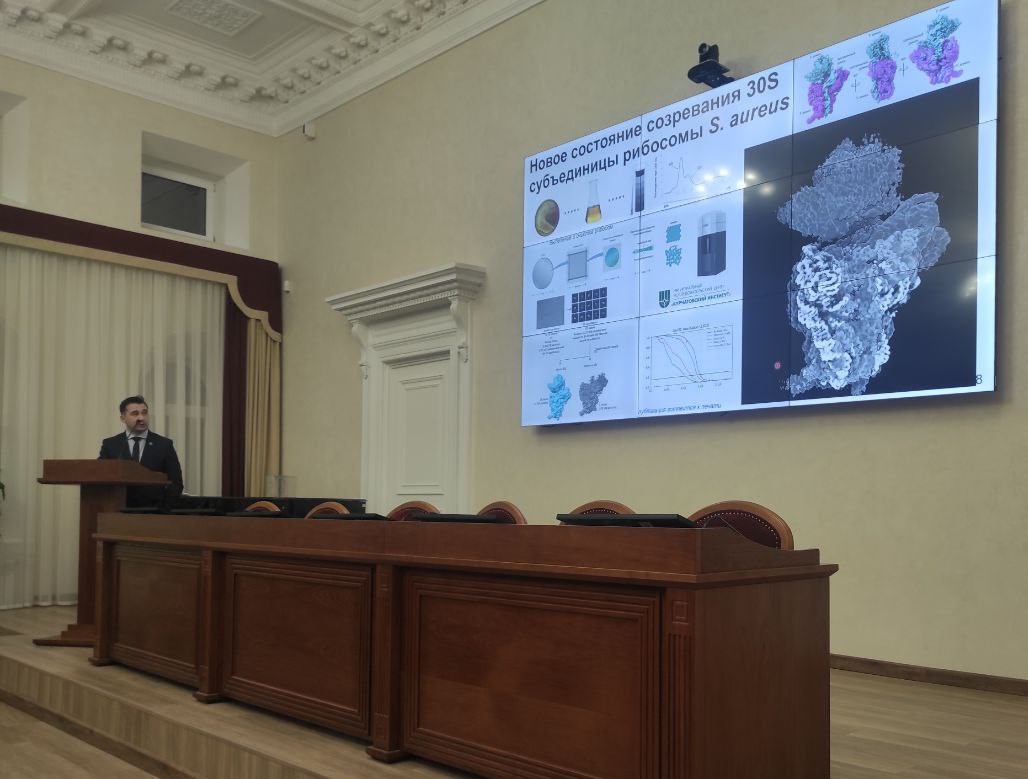 - Заведующий лабораторией структурного анализа биомакромолекул — д.ф.-м.н., Усачев Константин Сергеевич рассказал о результатах, полученных в процессе проведенной в отчетном году работе по теме: «Поиск путей регуляции трансляции, транскрипции и снижения вирулентности патогенных микроорганизмов на основе анализа механизма межмолекулярных взаимодействий методами структурной биологии», выполненной в рамках Программы фундаментальных научных исследований государственных академий наук на 2024-2026 годы.